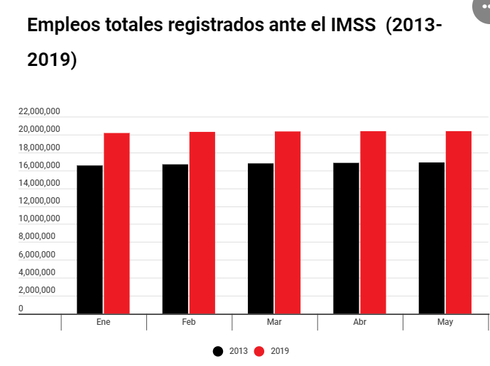 Por otro lado, para los primeros cinco meses del año en curso, que marca el arranque del gobierno de Andrés Manuel López Obrador, el IMSS registró 20,382,910, creando 474,838 nuevos empleos totales, que indican un crecimiento de 2.4 por ciento respecto al mismo lapso de 2018.