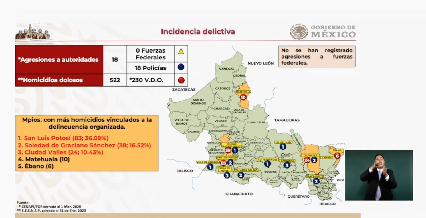 Finalmente, Rafael Ojeda precisó que San Luis Potosí ocupa lugar diecinueve en homicidios dolosos, así como el catorce en cualquier tipo de delitos, siendo que esta concentración desde diciembre de 2018 a la fecha el estado ha derivado en una baja de la delincuencia delictiva.