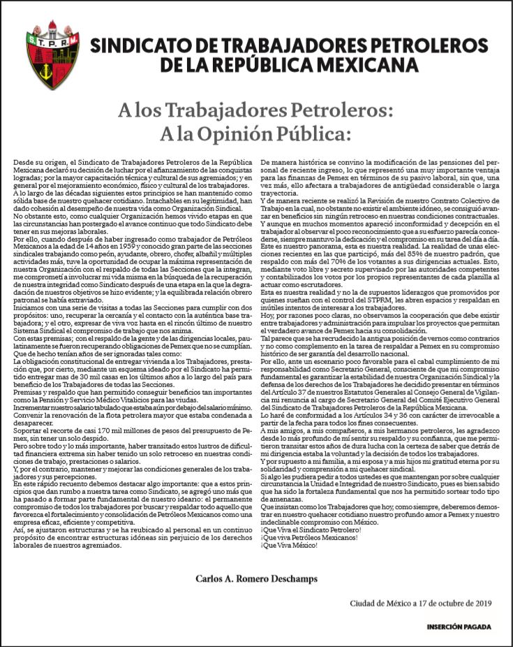 Por lo anterior, ambos gremios recordaron que Carlos Romero Deschamps obtuvo grandes ganancias ocupando diversos cargos en el Sindicato de Trabajadores Petroleros de la República Mexicana (Stprm).