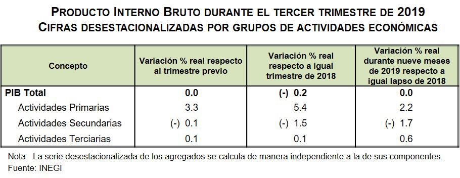 A través de un informe tras rectificar la información el PIB, el cual se contrajo 0.1 por ciento, el instituto precisó que en cuestiones económicas hubo una tasa nula de crecimiento durante el tercer trimestre de 2019.
