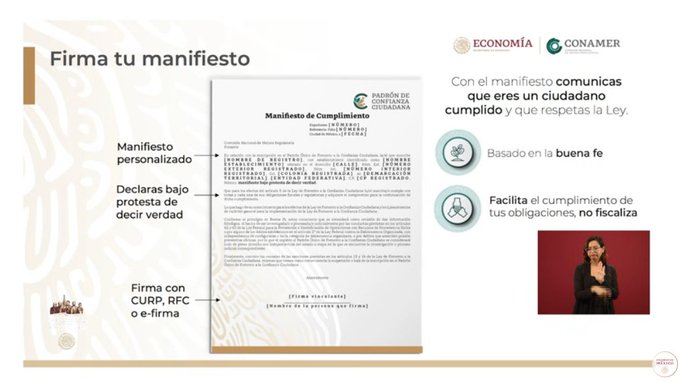 Por otra parte, se invita a los ciudadanos a firmar su manifiesto con su CURP, RFC o e-firma, cuyo fin es comunicar que se es una persona cumplida y que respeta la ley; dicho documento está basado en la buena fe y facilita el cumplimiento de las obligaciones, sin embargo, este no funciona para fiscalizar.