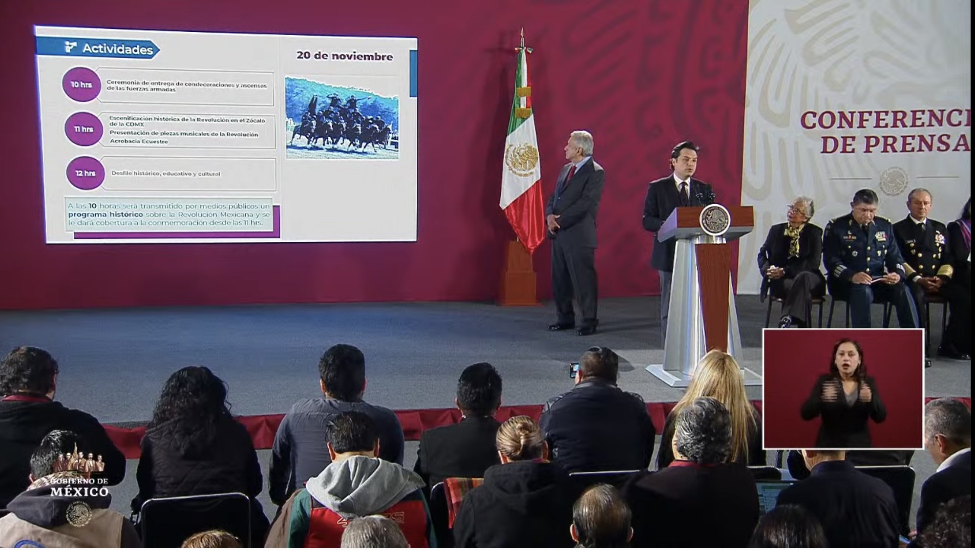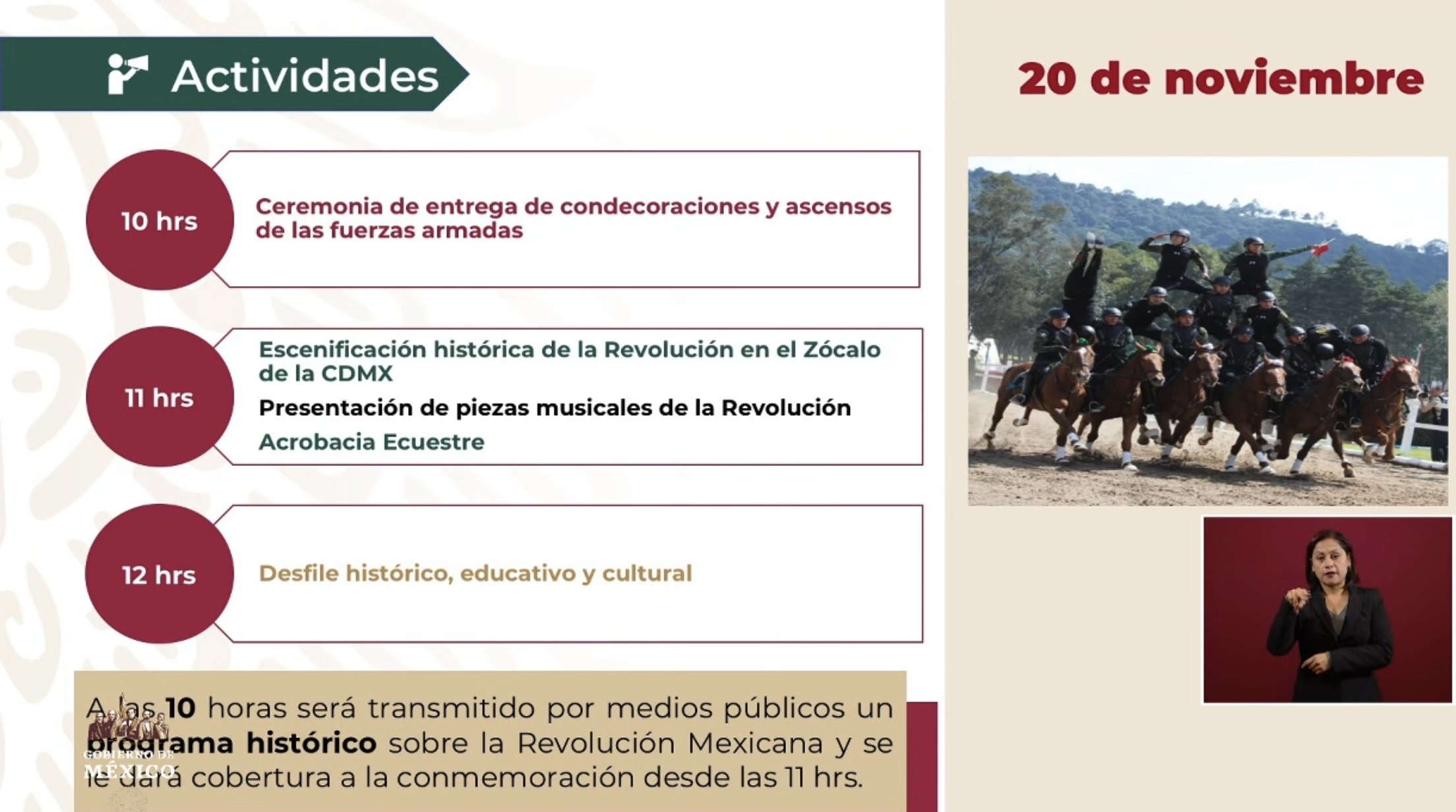 A mayor detalle, Zoé Robledo indicó que a las diez de la mañana del 20 de noviembre se realizará una ceremonia de entrega de condecoraciones y ascensos de las Fuerzas Armadas; a las once horas habrá una escenificación histórica de la Revolución Mexicana en el Zócalo capitalino, así como una presentación de piezas musicales y acrobacia ecuestre.
