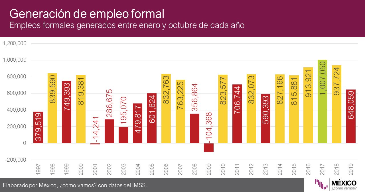 En este contexto, AMLO indicó que todavía falta la medición de los últimos dos meses del año, por lo que estimó que en lo que resta de noviembre y diciembre se logre llegar a los 900 mil empleos formales.