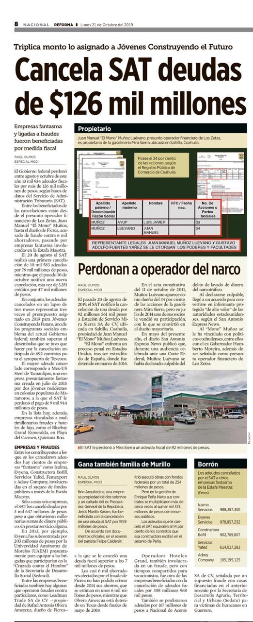 En este escenario, MCCI precisa que la cancelación de dicho adeudo del presunto operador financiero del cartel de Los Zetas se notificó por el SAT el pasado 20 de agosto de 2019; incluso detalla que al menos dos empresas dedicadas a la distribución de combustible en las que El Mono aparece como accionista, todavía operan en Coahuila.