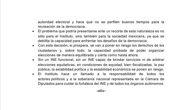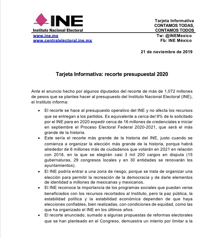 En el mencionado texto, el instituto señala que dicho recorte equivale a cerca del nueve por ciento de lo solicitado para la expedición de cerca de 16 millones de credenciales electorales, además de que el Proceso Electoral Federal 2020-2021 se iniciaría en el mes de septiembre.