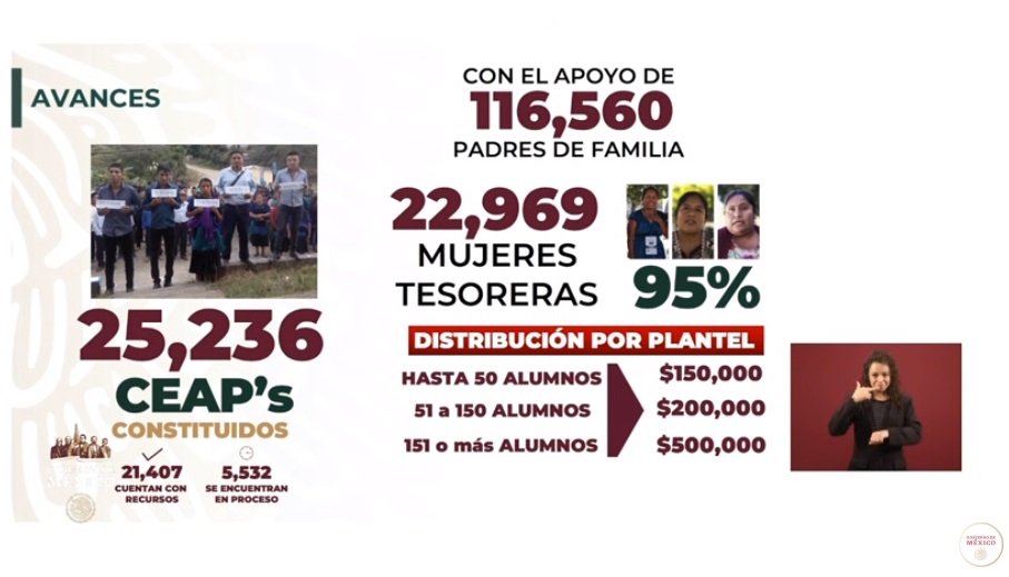 Sobre este último punto, Esteban Moctezuma subrayó que las escuelas con 50 alumnos reciben un total de 150 mil pesos; los planteles con 51 a 150 alumnos, 200 mil pesos; y aquellas con más de 151 alumnos, 500 mil pesos.