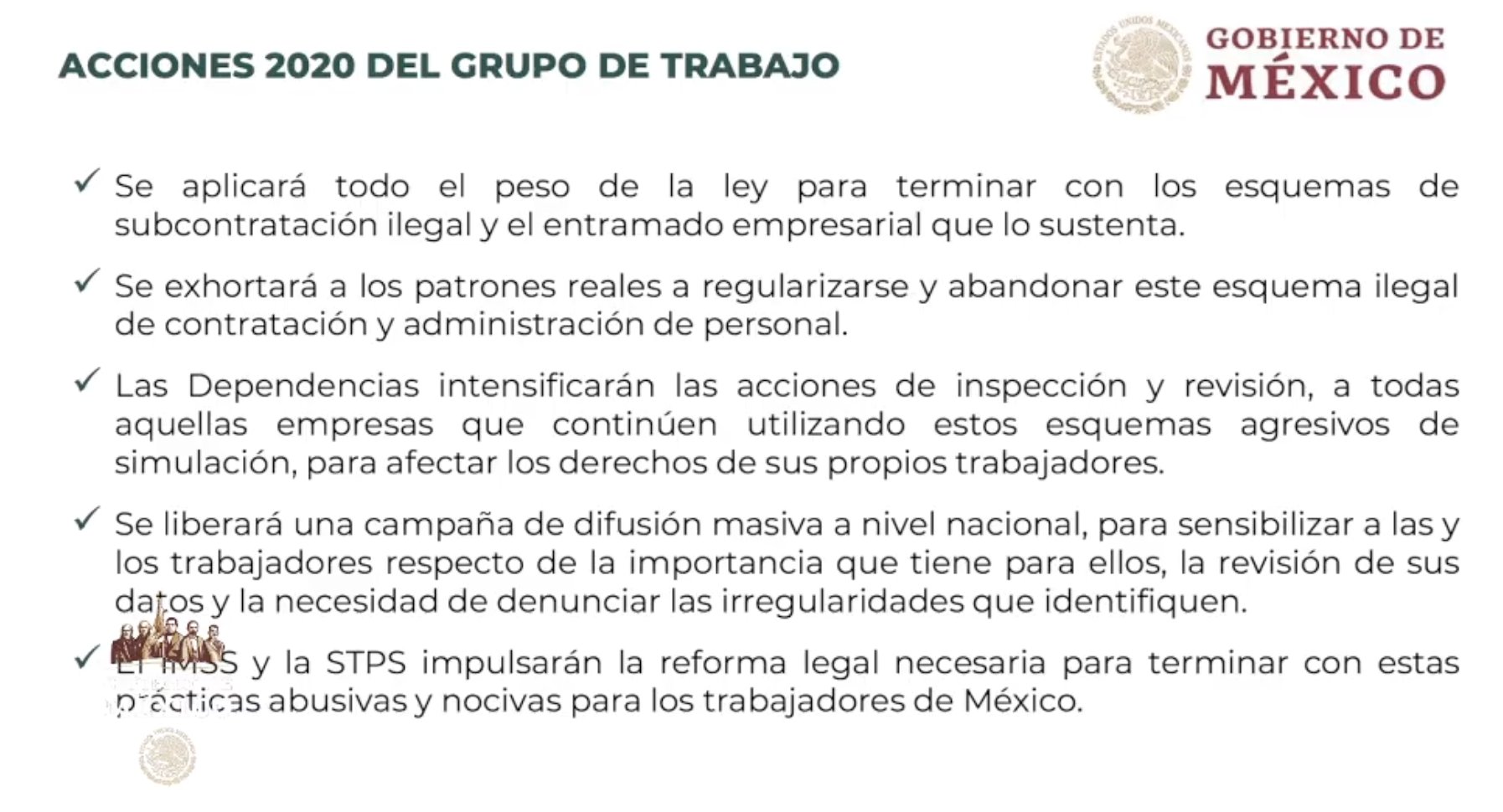 Por lo anterior, el grupo de trabajo integrado por las dependencias antes mencionadas realizará durante 2020 acciones específicas sobre estas empresas, hasta garantizar el cumplimiento de las leyes en la materia.