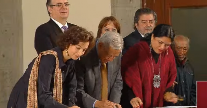 Asimismo, al interior de Palacio Nacional se realizó la suscripción del convenio entre Unesco y Secretaria de Cultura, el cual tiene como fin fortalecer las lenguas indígenas para que estas puedan seguir siendo transmitidas de generación en generación.