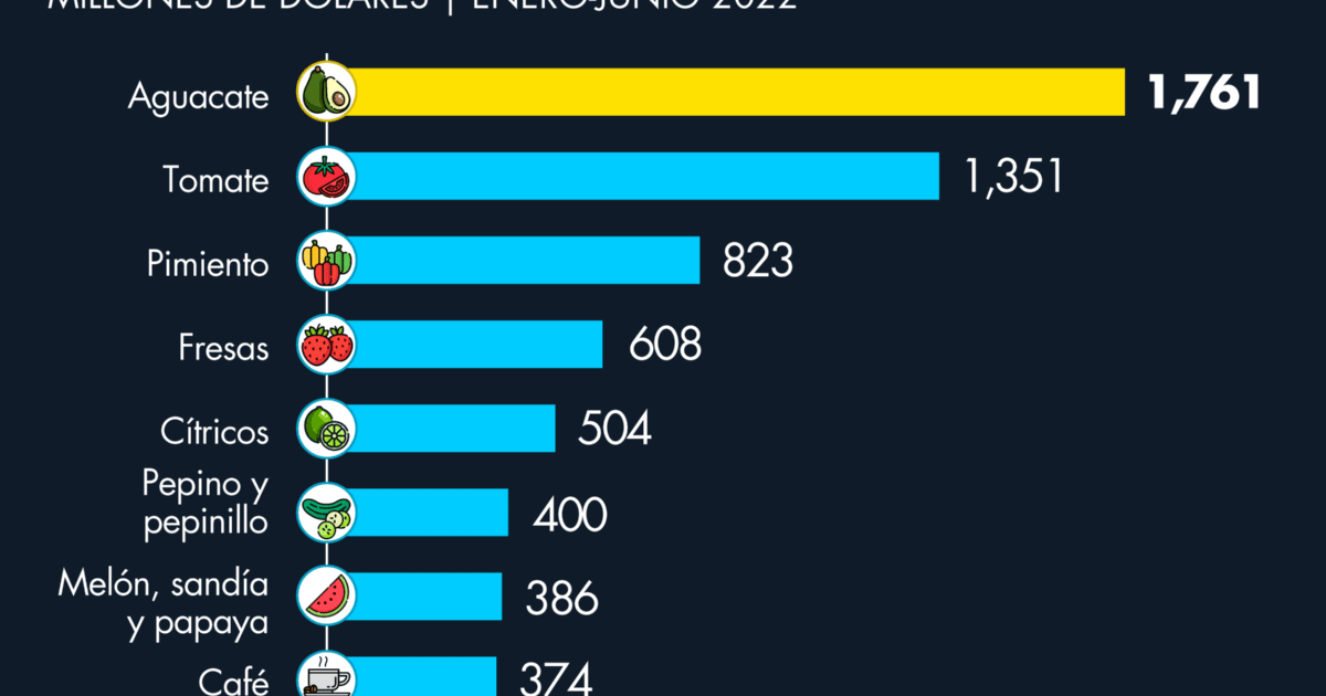 De enero a junio de 2022, las mercancías agropecuarias y pesqueras con mayor venta de México al extranjero son: el aguacate, el tomate, el pimiento, las fresas y los cítricos, de acuerdo con cifras del Banco de México.