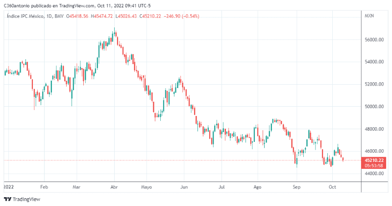 En este contexto, el índice principal S&P/BMV IPC de la Bolsa Mexicana de Valores (BMV), integrado por las 35 acciones locales más líquidas, cae 0.54% a 45,210.22 puntos. El FTSE BIVA, de la Bolsa Institucional de Valores (Biva), cede 0.46% a 942.52 unidades.