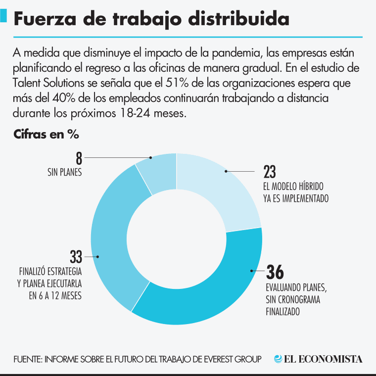De acuerdo con el estudio “El futuro del trabajo: Reimaginar la fuerza laboral y la mecánica del lugar de trabajo” de Everest Global/ManpowerGroup Talent Solutions, en el que se entrevistó a 200 líderes senior de recursos humanos, se señala que a medida que retrocede el impacto de la pandemia, las organizaciones están planificando el regreso de los empleados a la oficina de manera gradual. Sin embargo, el 51% de las organizaciones espera que más del 40% de los empleados continuarán trabajando desde casa durante los próximos 18-24 meses.