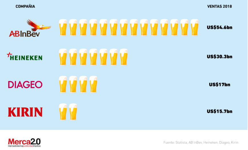 De acuerdo con Merca20 la Anheuser-Busch InBev, firma detrás de marcas como Budweiser, Corona y Stella Artois, destaca por encima de la competencia, en 2018 la empresa belga logró ventas por 54 millones 600 mil dólares a nivel mundial; detrás de esta compañía se ubica Heineken, firma detrás de la marca homónima, Cerveza Sol y Amstel, que logró ventas por 30 millones 300 mil dólares; y en tercer y cuarto lugar se ubican Kirin y Diageo, firmas detrás de marcas como Myanmar, Captain Morgan, Baileys y Smirnoff.