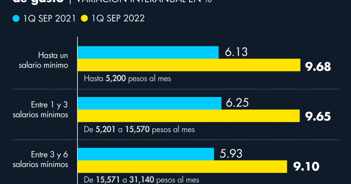 Al corte de la primera quincena de septiembre del 2022, la tasa de inflación interanual para las familias que ingresan hasta un salario mínimo fue de 9.86%, mientras que para las que ingresan más de seis salarios mínimos se ubicó en 8.25%, de acuerdo con cifras del Inegi.
