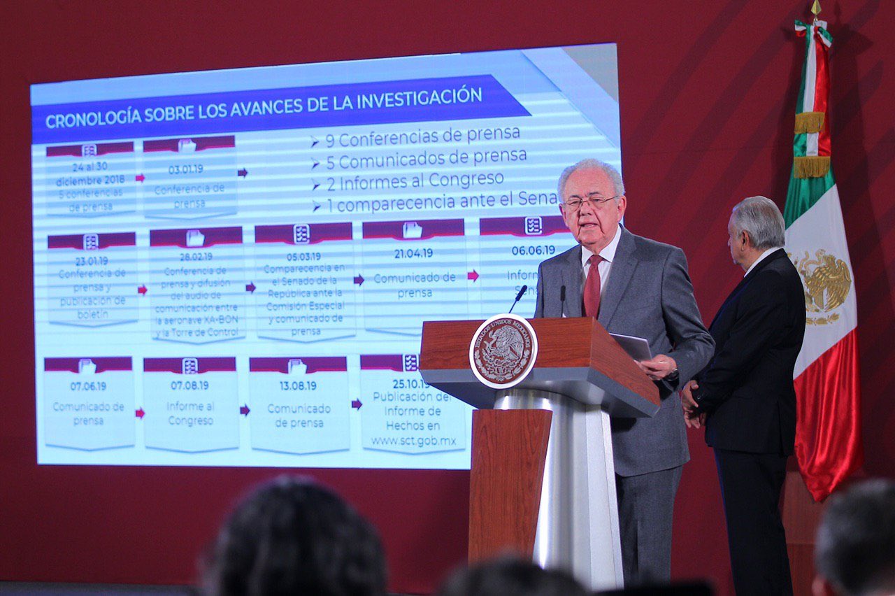 Durante la conferencia de prensa de este viernes, el presidente de México, Andrés Manuel López Obrador (AMLO), y el titular de la Secretaría de Comunicaciones y Transportes (SCT), Javier Jiménez Espriú, dieron a conocer el informe sobre las causas del accidente aéreo en el que falleció la gobernadora de Puebla, Martha Erika Alonso, y su esposo Rafael Moreno Valle.