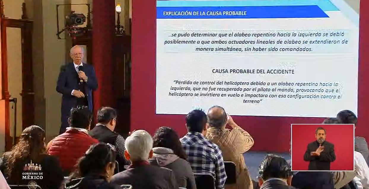Respecto a los sistemas de aumento de estabilidad, Jiménez Espriú destacó que hubo hallazgos importantes que exponen que la causa probable del accidente fue la pérdida del control del helicóptero, lo que provocó que se invirtiera el vuelo dando un alabeo repentino hacia la izquierda y se impactara contra el terreno.
