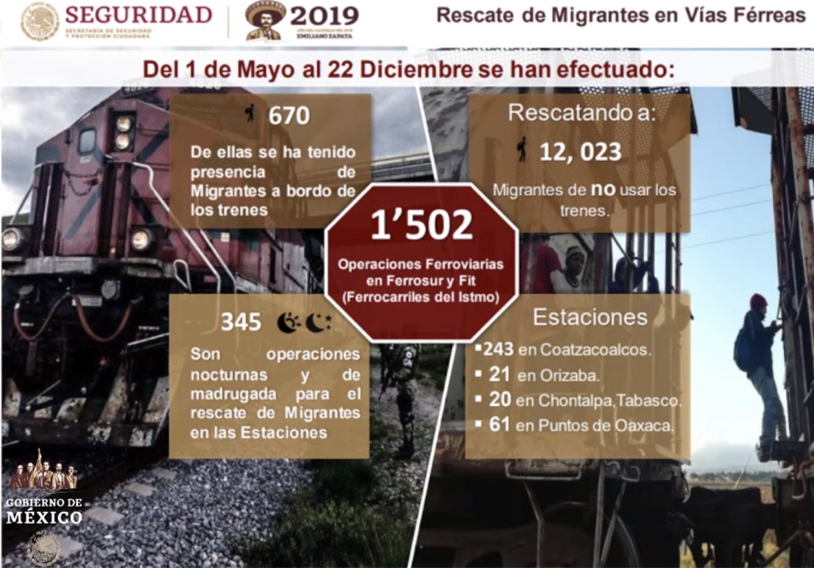 A decir de los rescates de migrantes en vías férreas, el titular de la SRE agregó que del 1 de mayo al 22 de diciembre se ha evitado que 12 mil 023 personas usen los trenes, además de que se han realizado mil 502 operaciones ferroviarias en Ferrosur y Fit, de las cuales 345 se realizaron durante la noche y madrugada en estaciones de Coatzacoalcos, Orizaba, Tabasco y puntos de Oaxaca.