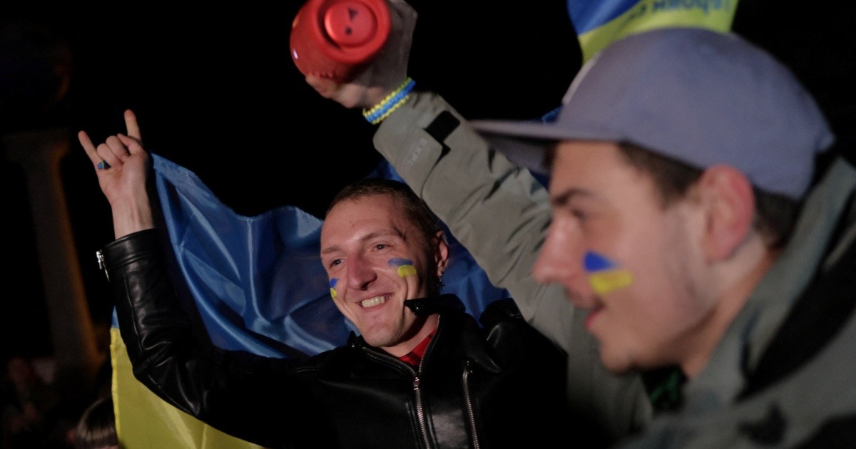 Allí se abrazaron, envueltos en banderas ucranianas, entonaron el himno nacional y descorcharon botellas de champán.